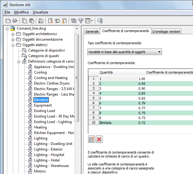 È possibile specificare un coefficiente di contemporaneità per calcolare la richiesta di carico stimata da un circuito. Il coefficiente di consumo può: