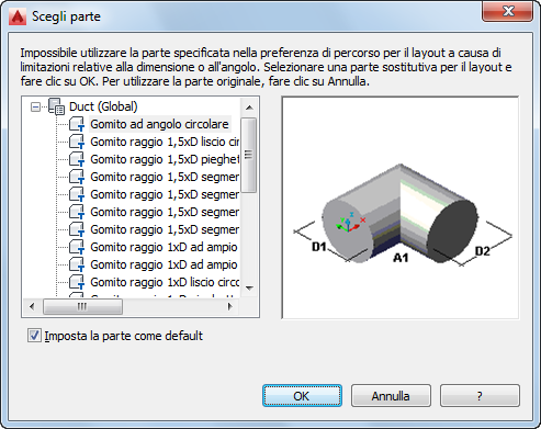La finestra di dialogo Scegli parte viene visualizzata se si tenta di aggiungere o modificare una parte in un tratto non memorizzato nelle preferenze. Verrà richiesto di effettuare una sostituzione dal catalogo. Nell'esempio riportato di seguito viene illustrata la finestra di dialogo del dominio Rete di canali aria nel profilo Globale: