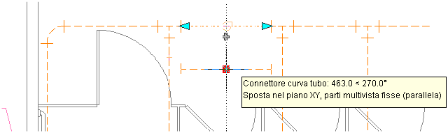 Osservare che i gomiti connessi alla linea idraulica si sono spostati insieme alla linea, mentre la lunghezza delle linee idrauliche connesse ai gomiti è cambiata. Il sistema è ancora connesso.