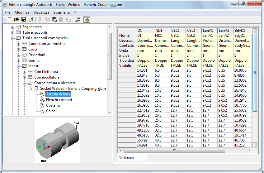 Il catalogo delle parti di tubo contiene migliaia di dimensioni per le parti. Il dominio Tubature include i seguenti tipi di parte: