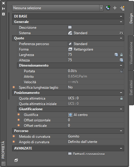 Nota: Nelle tabelle seguenti, le proprietà relative all'aggiunta di un canale aria sono precedute da un asterisco (*), le proprietà relative al canale aria flessibile sono precedute da due asterischi (**) e le proprietà relative ai raccordi di canale aria sono precedute da tre asterischi (***). Queste proprietà sono disponibili solo quando si aggiunge il rispettivo oggetto.