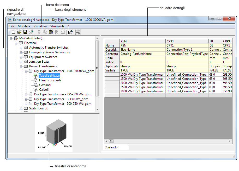 Nella finestra dell'immagine di anteprima nell'angolo inferiore sinistro dell'Editor cataloghi le parti vengono visualizzate come immagini tridimensionali sottoposte a rendering. I parametri che definiscono la parte sono chiamati quote.