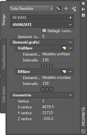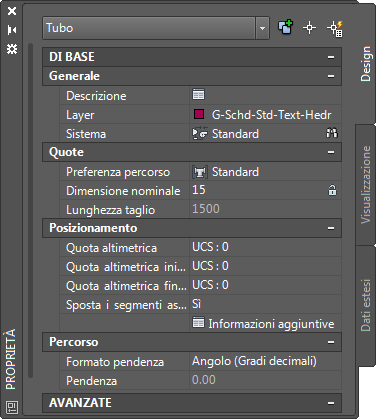 In questa sezione vengono definite le proprietà della scheda Design del riquadro Proprietà da utilizzare per modificare il sistema di tubature. La scheda Design è suddivisa in due sezioni: DI BASE e AVANZATE.