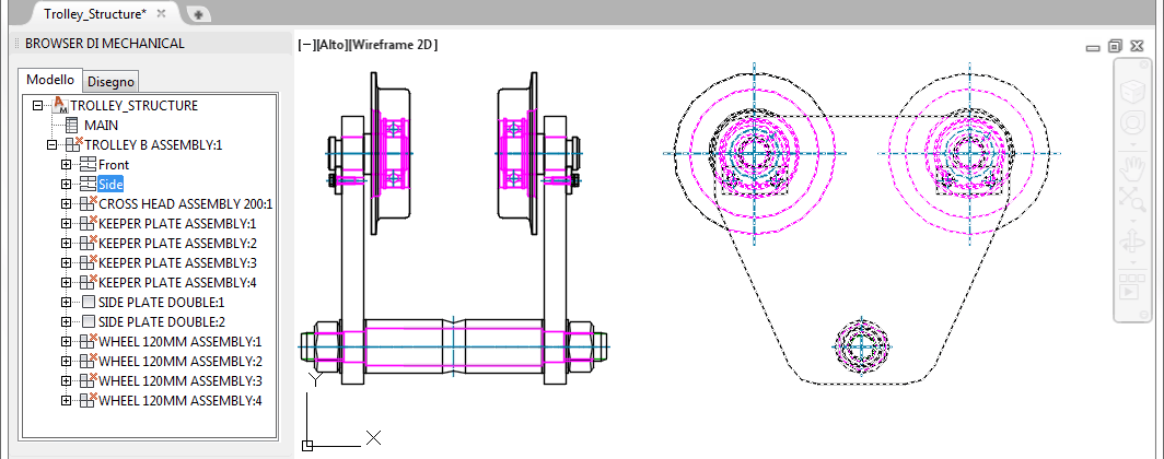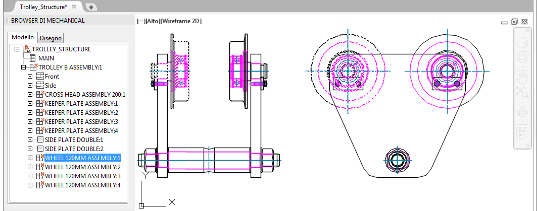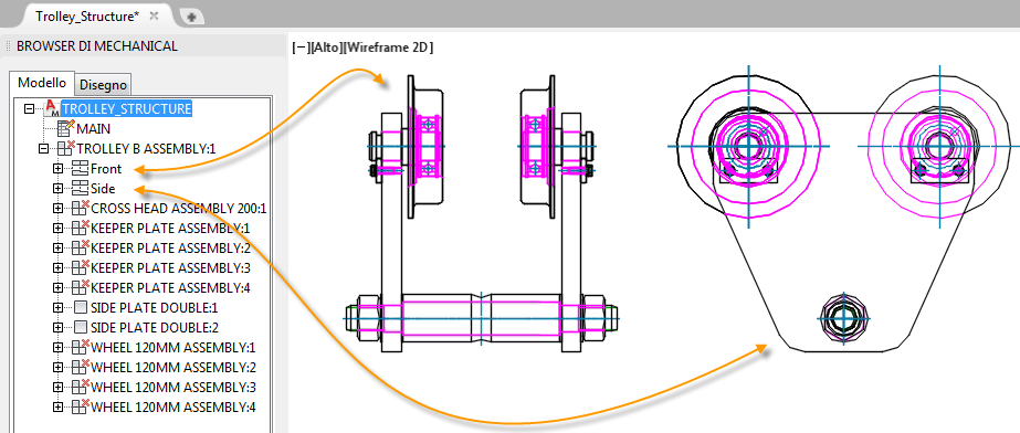 Ogni componente dispone di almeno una vista. In questo esempio il componente assieme TROLLEY B ASSEMBLY dispone di due viste componenti.