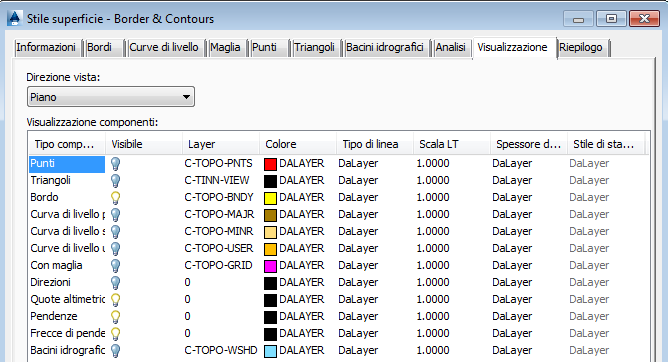 Aprire il file degli stili di esempio, Sample_styles.dwg, in C:\Programmi\AutoCAD 2018\C3D\Help\Civil Best Practices Guide. Gli stili di superficie sono stati progettati per visualizzare i diversi componenti di una superficie nelle varie fasi della progettazione. Lo stile di superficie assegnato alla Carta è denominato Existing Ground Contours e rappresenta un esempio di stile in genere utilizzato durante la fase di ideazione di un progetto.