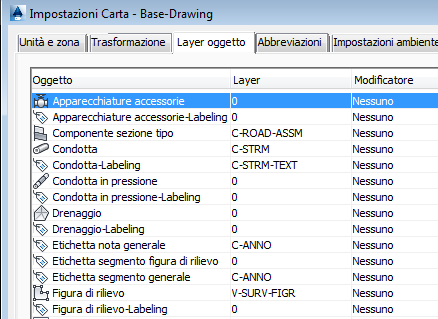 Per un'elaborazione più veloce, congelare o disattivare i layer della Carta contenenti oggetti. Per default, gli oggetti di progettazione e le relative etichette sono divisi in più layer. Ad esempio, come illustrato nella figura 5, tracciati, profili e altri oggetti del progetto stradale sono dispersi su diversi layer che iniziano tutti con C-ROAD. Se si consolidano gli oggetti del progetto stradale su un numero inferiore di layer, sarà più semplice attivarli o disattivarli.