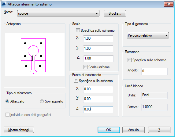 - Nella finestra di dialogo Riferimenti esterni, impostare Punto di inserimento su 0,0,0, Scala su 1,1,1, e Angolo di rotazione su 0.