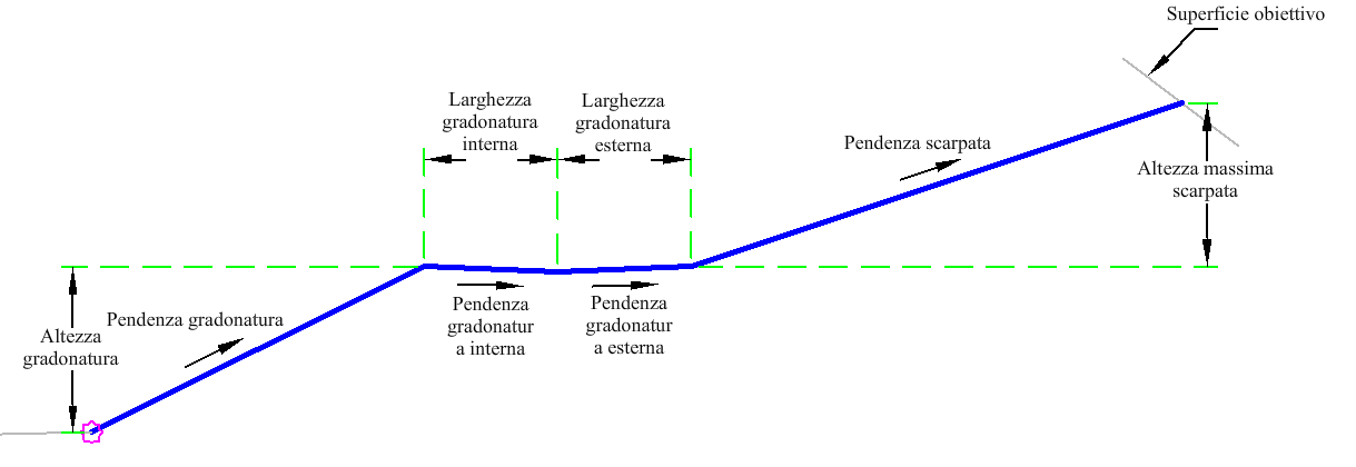 Il punto di cardine iniziale è impostato al punto di associazione. La quota altimetrica del punto di cardine viene verificata rispetto alla superficie obiettivo per determinare se la sezione è in condizione di scavo o di rilevato. Un'intercettazione viene calcolata sulla superficie obiettivo mediante la Pendenza scarpata data. Se l'altezza dell'intercettazione supera il valore Altezza massima scarpata, viene inserito il collegamento ad Altezza gradonatura e viene aggiunta la gradonatura. Il punto di cardine viene ripristinato sul bordo esterno della gradonatura e il processo viene ripetuto fino a quando viene trovato un collegamento di scarpata che non superi l'Altezza massima scarpata.
