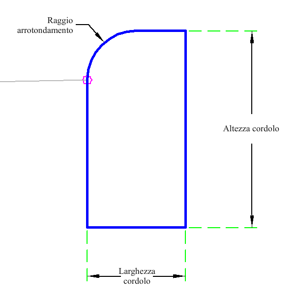 Raggio per l'arrotondamento nella parte anteriore del cordolo. | Numerico, positivo |