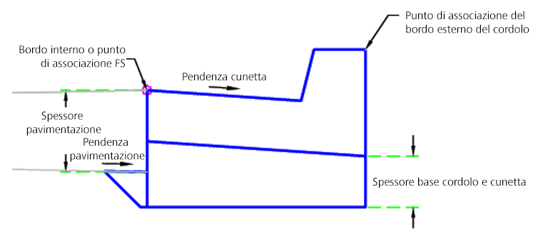 | Punto di associazione | Punto di associazione del cordolo o di cordolo e cunetta | Bordo interno o FS/Esterno del cordolo | Bordo interno o FS |
