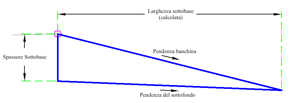 La banchina viene inserita in corrispondenza dei valori di profondità, inclinazione e sottofondo specificati. La larghezza è calcolata nel punto di intersezione tra l'inclinazione e il sottofondo della banchina. Quindi vengono calcolati i punti, i collegamenti e le forme.