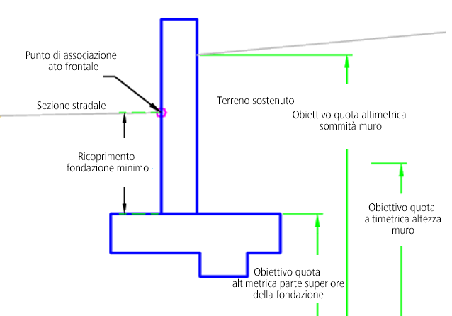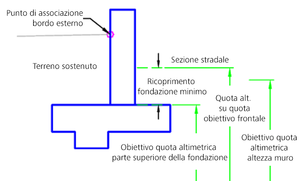 | Parte superiore del muro | Può essere utilizzato per sostituire la quota altimetrica della sommità del muro quando il punto di associazione è sul lato anteriore. Come obiettivi per la specifica della quota altimetrica è possibile utilizzare i seguenti tipi di oggetti: profili, polilinee 3D, linee caratteristiche o figure di rilievo. | Facoltativo |