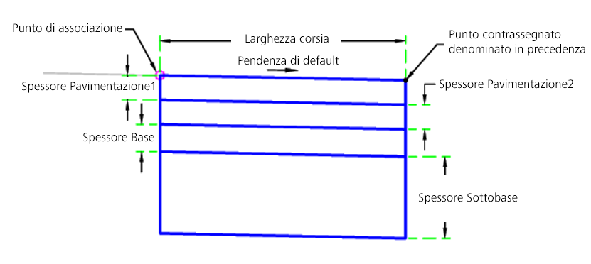 | Punto di inserimento | Specifica il punto di inserimento della corsia in corrispondenza del colmo stradale o del ciglio della corsia | Crown/EdgeOfTravelWay | Crown |