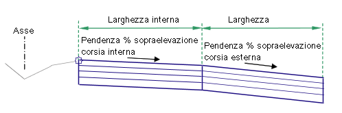 Questo componente sezione tipo crea un gruppo di corsie interne ed esterne che possono avere pendenze diverse. Le corsie interne vengono inserite verso l'esterno dal punto di associazione mediante la pendenza di sopraelevazione della corsia interna. Se la sopraelevazione non viene definita a seconda di una progressiva, viene utilizzato il valore Pendenza % interna di default. Le corsie esterne vengono inserite verso l'esterno dall'estremità delle corsie interne mediante la pendenza di sopraelevazione della corsia esterna oppure la Pendenza % esterna di default.