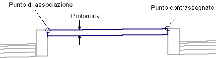 La sommità del collegamento allo spartitraffico viene inserita tra il punto di associazione e il punto contrassegnato. Se il valore Profondità specificato è diverso da zero, il fondo del collegamento allo spartitraffico viene inserito parallelamente alla sommità e vengono aggiunti collegamenti verticali per chiudere la forma.