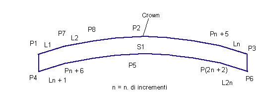 Successivamente, viene definita una linea di corda unendo i punti di sbalzo sinistro e destro (che corrispondono ai cigli appena stabiliti). La linea di corda viene divisa per il parametro "numero di incrementi" e il valore centrale viene utilizzato come scostamento del "punto del colmo stradale". La quota altimetrica del punto del colmo stradale viene stabilita aggiungendo il parametro "altezza colmo stradale" alla quota altimetrica del punto centrale sulla linea di corda.