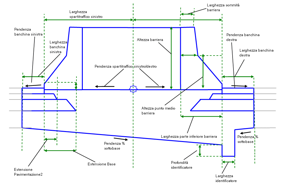 Questo componente sezione tipo consente di inserire uno spartitraffico in corrispondenza dell'asse, con barriere asimmetriche su entrambi i lati dell'asse e una parte inferiore rastremata con eventuale estensione di drenaggio.