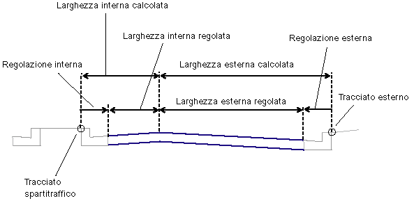 Regolazione interna ed esterna: i parametri Regolazione interna e Regolazione esterna vengono specificati nel caso in cui i tracciati utilizzati per i bordi esterni o interni si trovano ad uno scostamento fisso rispetto al ciglio della corsia corrente. Ad esempio, il tracciato utilizzato per il bordo dello spartitraffico può trovarsi sulla parte esterna del cordolo invece che sul ciglio della pavimentazione. In questo caso il parametro Regolazione interna dovrebbe essere impostato sulla larghezza del cordolo.
