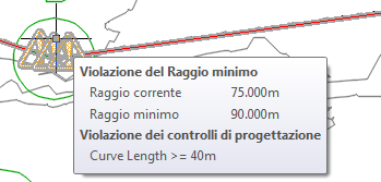 • La prima violazione riguarda la curva che non soddisfa il raggio minimo consigliato. Vengono visualizzati il valore di parametro minimo e quello del raggio della curva.