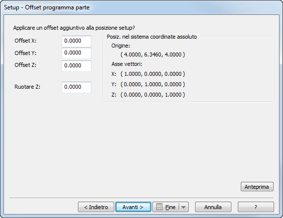 Questa pagina permette di traslare la posizione del setup. Uno dei motivi per cui traslare il Setup è quello di modellare grezzo aggiuntivo sopra alla parte che viene rimosso durante un'operazione di spianatura. Si potrebbe anche voler traslare ad una posizione se non si riesce ad eseguire facilmente lo snap.