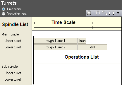 In this example, the machine has two tool posts that can cut parts on the main spindle. The main spindle has a roughing operation that is performed simultaneously on both tool posts. The identical length of the boxes surrounding the roughing operations shows that they will take the same time to cut.