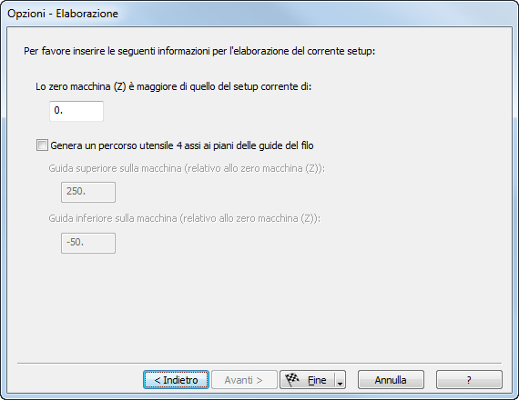 Per queste macchine, selezionare Genera un percorso utensile 4 assi ai piani delle guide del filo e inserire i piani Z della Guida superiore e della Guida inferiore.