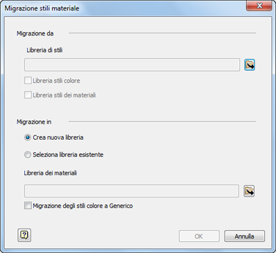 - Specificare la posizione di Migrazione a che di solito corrisponde al file InventorMaterialsLibrary.adsk o a una libreria personalizzata da creare. Per default, il percorso è C:\Utenti\Pubblica\Documenti\Autodesk\Inventor 201_\Design Data\Materials in Windows 7.