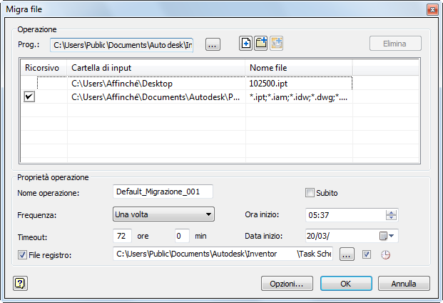 Programmazione operazioni genera un file di registro in cui vengono memorizzati i file migrati correttamente e non. Il file è in formato ASCII (.txt) e si trova per default in C:\Documenti\Inventor<versione >\Task Scheduler\Log & Report Files o C:\Utenti\Pubblica\Documenti\Autodesk\Inventor <versione>\Task Scheduler Logs & Reports.