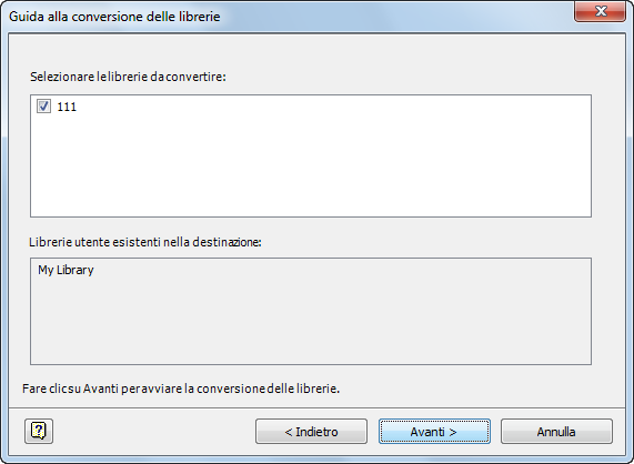 - Fare clic sul pulsante "Guida alla conversione delle librerie..." per visualizzare la relativa finestra di dialogo. Vedere la figura 2. Selezionare Da Contenuti desktop di Inventor a Autodesk Vault Server.