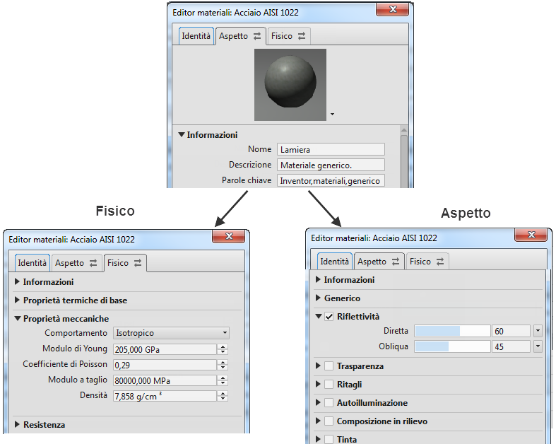 Le definizioni di materiale sono dotate di diverse proprietà assegnate. Inventor ne utilizza due: Aspetto e Fisiche. Ognuno dispone di specifiche proprietà che contribuiscono alla definizione del materiale.