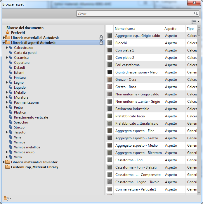 Per gestire ed esaminare gli asset disponibili, utilizzare il Browser asset. Questa funzione è utile per trovare un asset da aggiungere a un materiale o per sostituire una risorsa esistente di un materiale.