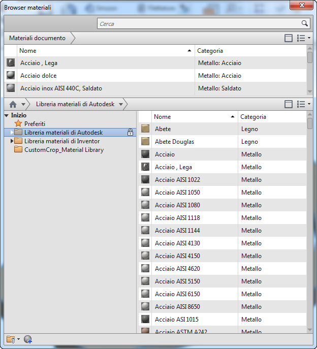 Il Browser materiali consente di individuare e gestire i materiali. Le operazioni comuni comprendono