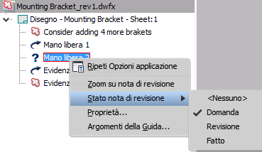 Le modifiche allo stato della nota di revisione vengono salvate e i commenti vengono aggiunti automaticamente da Inventor nel file DWF dove saranno inclusi alla pubblicazione successiva. È inoltre possibile salvare le modifiche alle note di revisione facendo clic con il pulsante destro del mouse sul nodo del gruppo di note di revisione e selezionando Salva modifiche cronologia note di revisione.