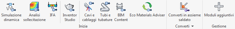 Nota: Gli ambienti Simulazione dinamica e Analisi sollecitazione sono disponibili sia nei prodotti Autodesk Simulation sia in Autodesk Inventor Professional. Gli ambienti Cavi e cablaggi e Tubi e tubature sono disponibili solo in Autodesk Inventor Professional.
