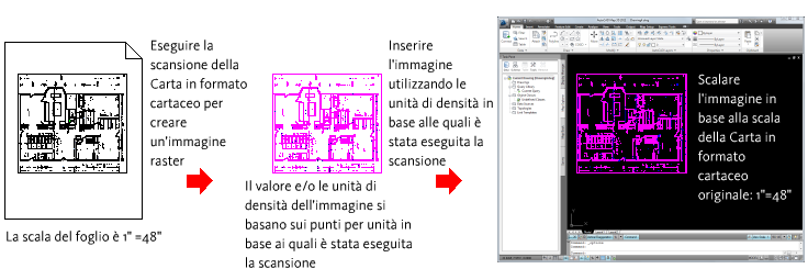 Il seguente esempio illustra il rapporto tra la scala su carta, le unità di densità e la scala di inserimento di un'immagine priva di riferimenti geografici, ovvero salvata senza dati di unità reali. Questa categoria comprende tutte le immagini disegnate utilizzando una scala, ad esempio una planimetria, e acquisite tramite scanner.