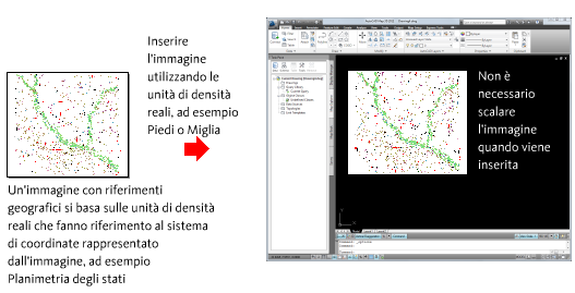 Il seguente esempio illustra il rapporto tra le unità di densità e un'immagine con riferimenti geografici. Poiché non esiste una scala su carta da prendere in considerazione, è possibile inserire l'immagine utilizzando le unità che questa rappresenta, ad esempio i piedi o le miglia, senza doverla ridimensionare in scala all'inserimento.