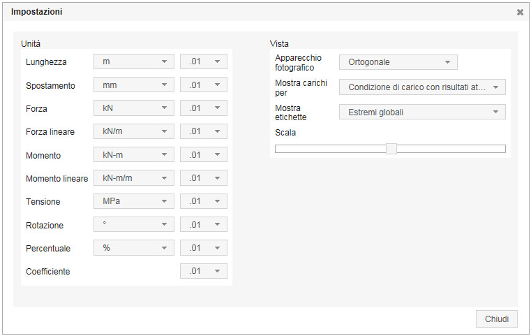 per aprire la finestra di dialogo Impostazioni, in cui è possibile specificare le impostazioni relative all'unità di misura per i risultati visualizzati nella vista e altre impostazioni di visualizzazione per il modello e i risultati.