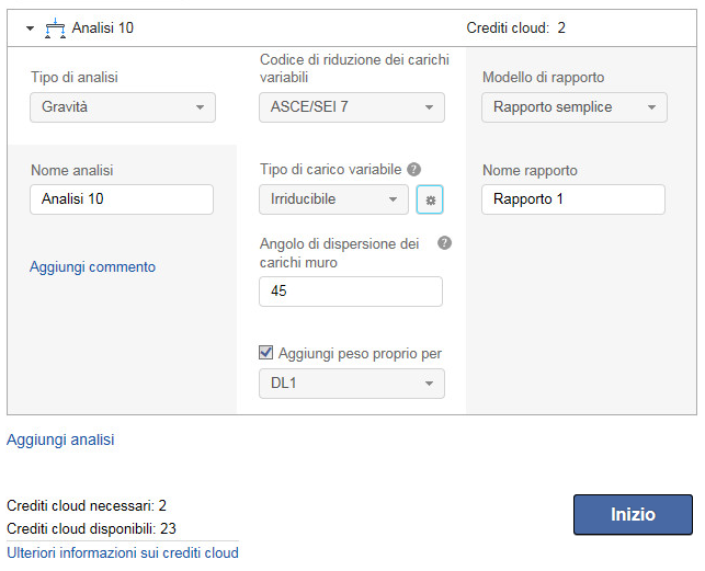 Viene visualizzata la pagina Nuova analisi, nella quale è possibile definire i parametri dell'analisi. Per default, vengono visualizzati il tipo e i parametri dell'analisi eseguita in precedenza.