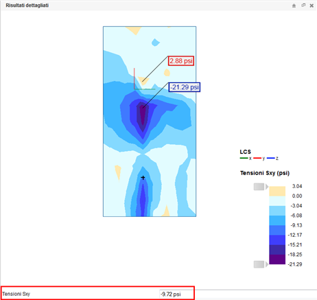 Esplora risultati dettagliati. Essa visualizza valori estremi del tipo di risultato selezionato, mappe (per elementi di superficie) e diagrammi (per elementi) per un elemento selezionato nella vista 3D (4). È inoltre possibile visualizzare i risultati in corrispondenza dei punti che si selezionano.