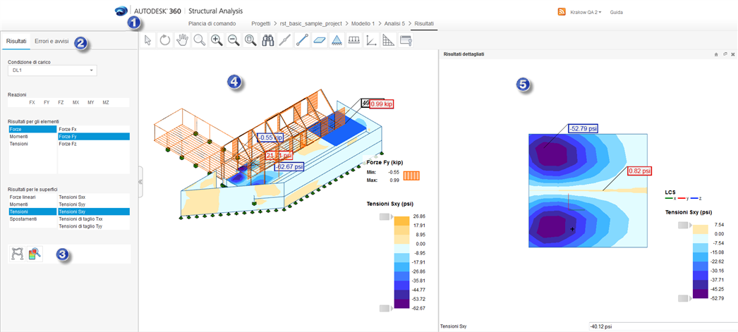 Solo sul sito Web è possibile visualizzare ulteriori tipi di risultati e analizzarli. Non è possibile scaricarli in Revit. I tipi di risultati disponibili variano a seconda del tipo di analisi. È inoltre possibile visualizzare i risultati dettagliati per un elemento selezionato nella vista. Vedere: Risultati in 3D Structure Viewer e Visualizzazione dei risultati di Structural Analysis in 3D Structure Viewer.