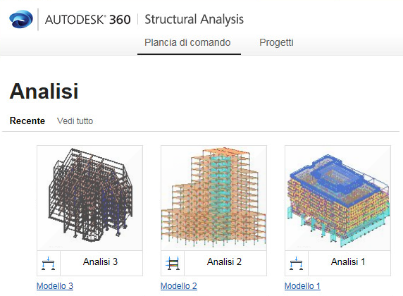 Autodesk® 360 Structural Analysis viene aperto sulla scheda Plancia di comando. Qui è possibile visualizzare le analisi eseguite di recente e le analisi condivise. L'icona accanto al nome dell'analisi indica il tipo di analisi: