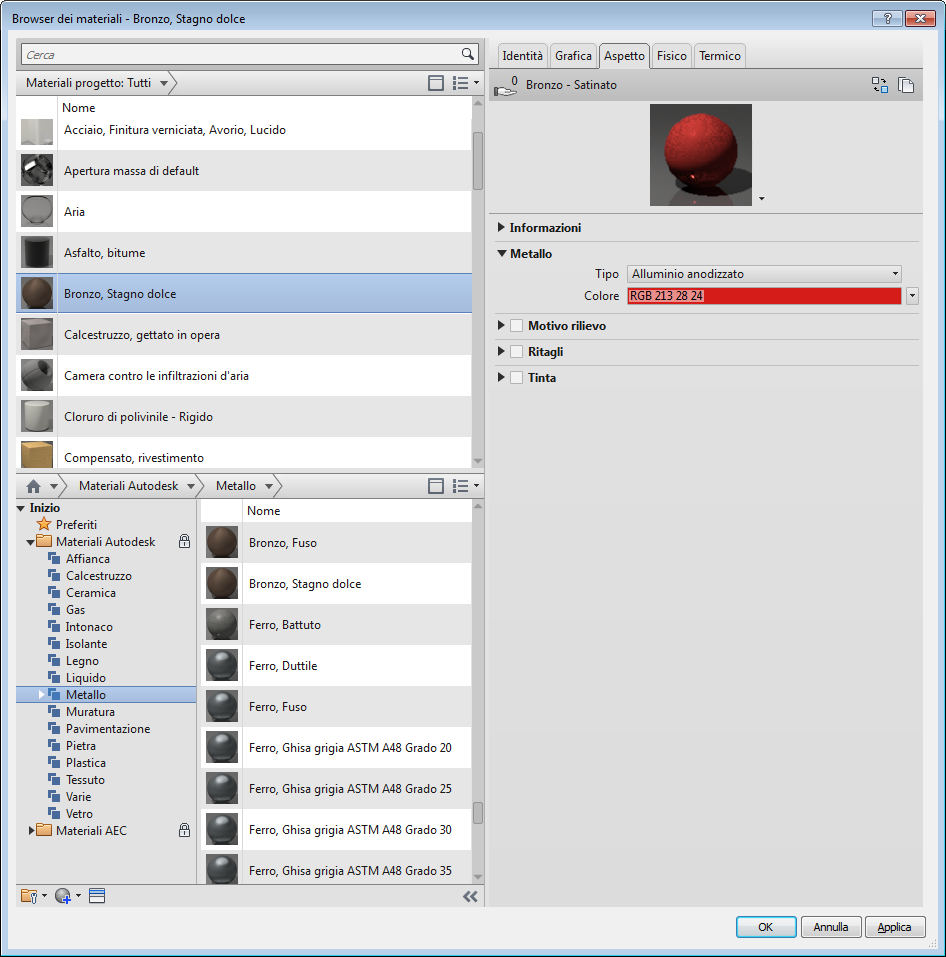 Le proprietà dell'aspetto sono raggruppate in un componente di progetto del materiale e vengono gestite nella scheda Aspetto. Altri componenti di progetto associati al materiale vengono gestiti nella scheda corrispondente. Ogni componente di progetto può essere modificato in modo indipendente durante la modifica di un materiale esistente in un progetto. Ad esempio, se si desidera che il materiale Bronzo sia di colore rosso, è possibile sostituire il componente di aspetto con Alluminio anodizzato, un componente con proprietà dell'aspetto diverse.