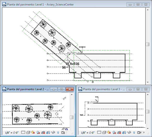 Nella parte superiore dell'illustrazione seguente vengono visualizzati i riquadri di definizione che circondano l'edificio principale e l'aviario. Il riquadro di definizione 1 è stato applicato alle linee di griglia dell'edificio principale, mentre il riquadro di definizione 2 è stato applicato alle linee di griglia dell'aviario. Di conseguenza, nelle viste dipendenti (parte inferiore dell'illustrazione) vengono visualizzate solo le linee di griglia appartenenti a ciascuna parte dell'edificio.