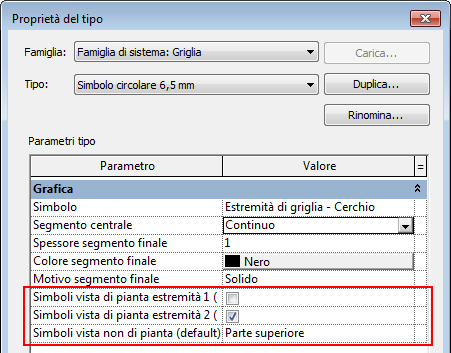 - Per visualizzare i simboli circolari in corrispondenza del punto finale delle linee di griglia in una vista di pianta, selezionare Simboli vista pianta estremità 2 (default).