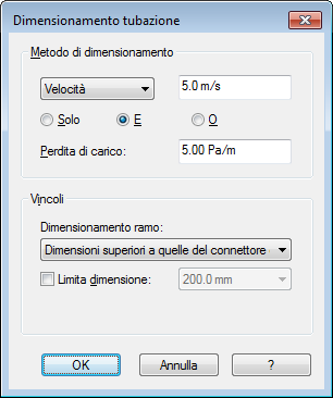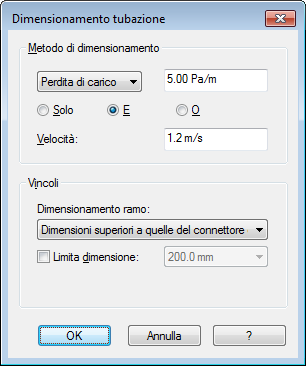 Le opzioni nella finestra di dialogo Dimensionamento tubazioni consentono di utilizzare ogni metodo da solo (selezionare Solo) o in combinazione con l'altro (selezionare E o O).