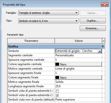 - Nascondere il segmento centrale delle linee di griglia per creare uno spazio, visualizzando così solo i segmenti finali nelle viste. È possibile modificare il tipo di griglia con simbolo circolare e spazio oppure creare un tipo personalizzato.