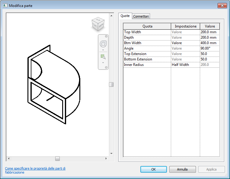 È possibile modificare una parte di fabbricazione in Revit per definire i valori di quota e le impostazioni del connettore necessari.