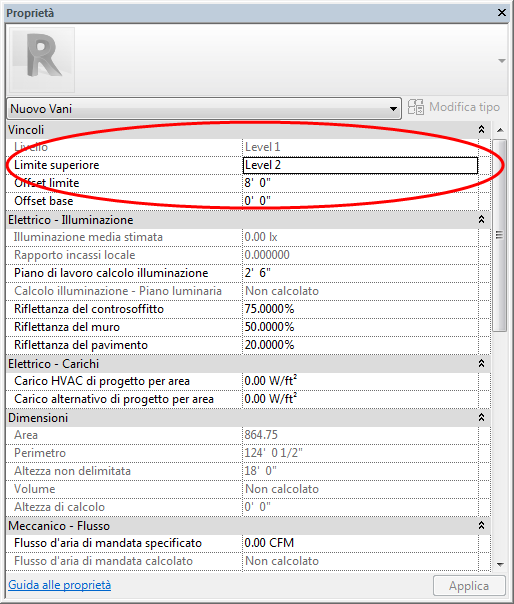 Vengono visualizzati due controlli di trascinamento (superiore e inferiore) e le quote interattive corrispondenti. I controlli di trascinamento, le quote e l'ombreggiatura indicano l'estensione verticale del vano selezionato. Il controllo di trascinamento e le quote superiori indicano l'offset del limite. Il controllo di trascinamento e le quote inferiori indicano l'offset base.