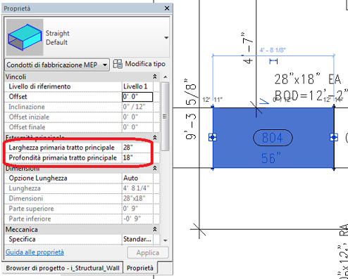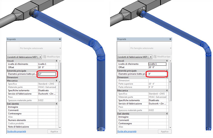 Nell'esempio riportato di seguito viene mostrato un tratto di condotto circolare selezionato. Nella tavolozza Proprietà, il campo Diametro primario tratto principale viene modificato da 12" a 8".