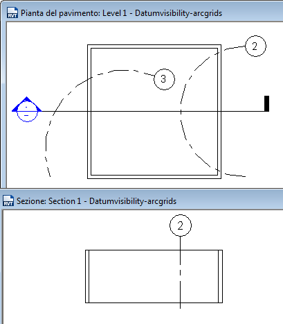 Le linee di griglia ad arco sono visualizzate nelle viste di sezione nel punto in cui il centro dell'arco interseca ed è perpendicolare alla linea di sezione.